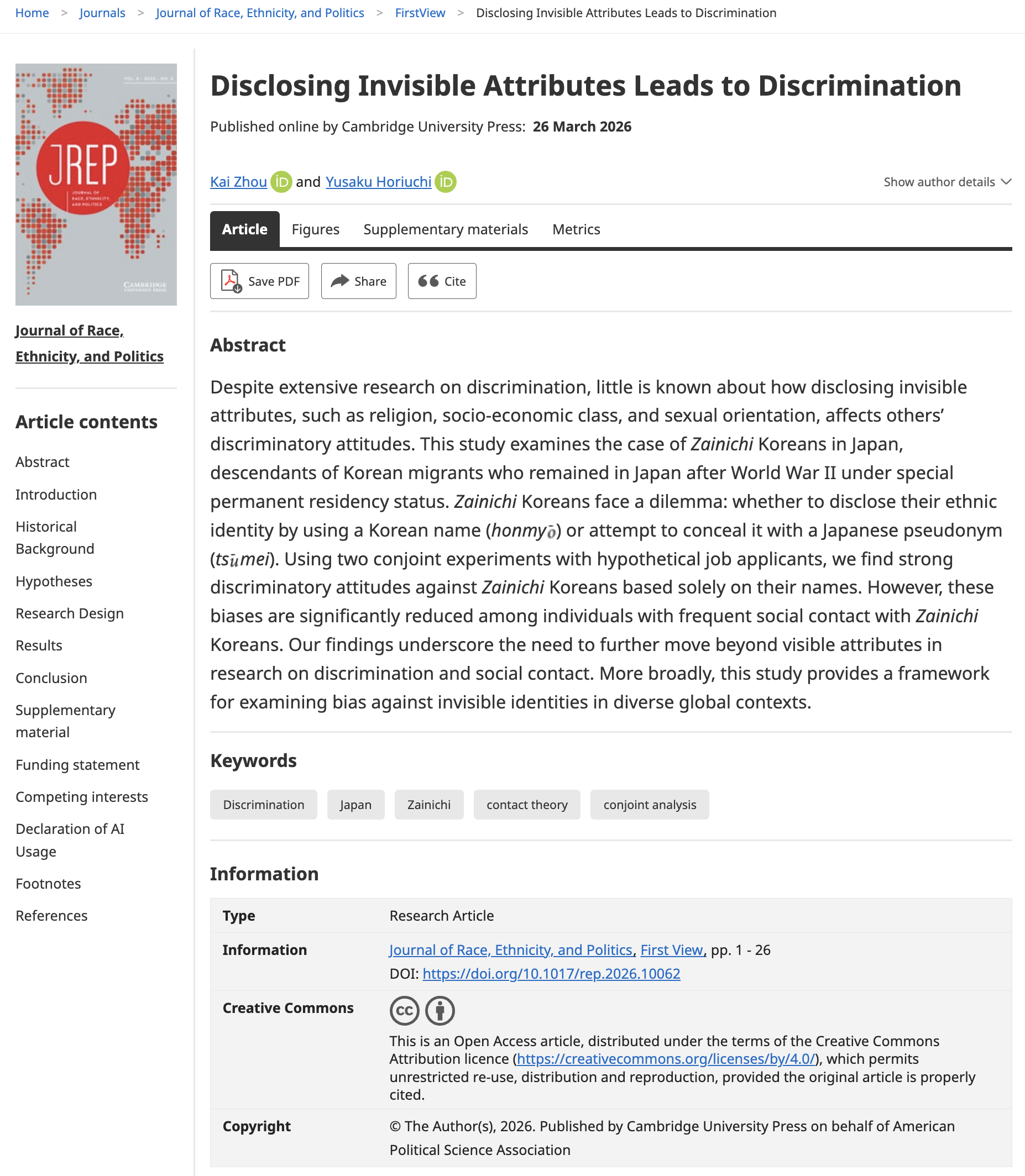 By adminPosted on March 26, 2026Posted in Diversity, Japanese politics Just published in the Journal of Race, Ethnicity, and Politics. Link: https://doi.org/10.1017/rep.2026.10062 Published in Journal of Race, Ethnicity, and Politics Post navigation Published in British Journal of Political Science